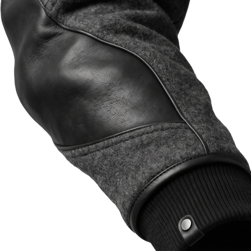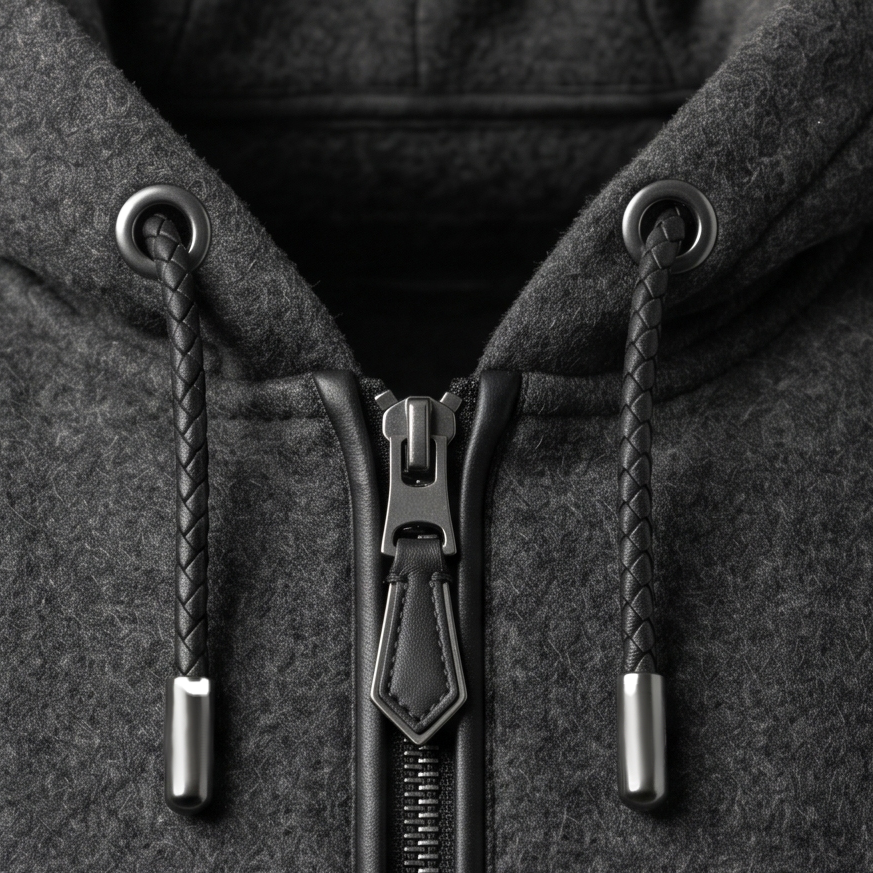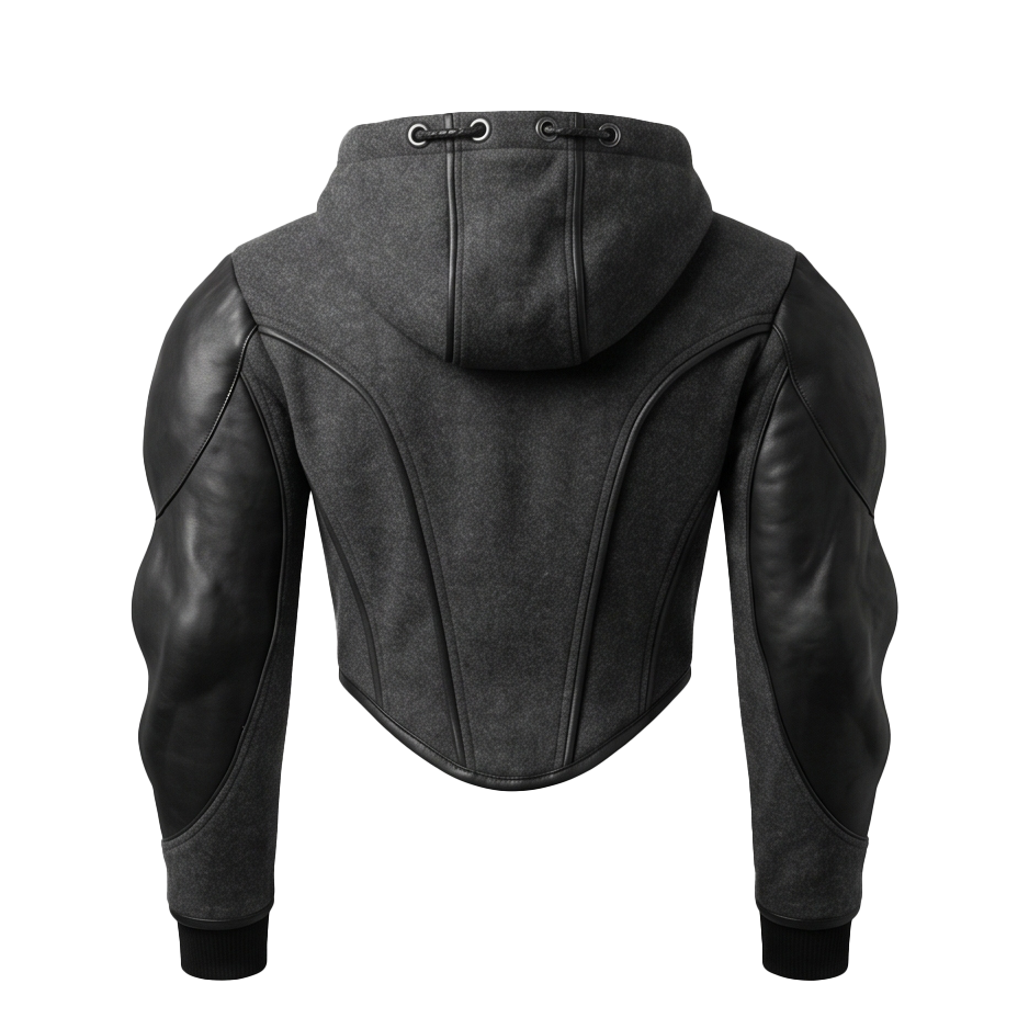 Armored heavyweight hoodie with leather detailing and protective shell panels around vital impact zones.
