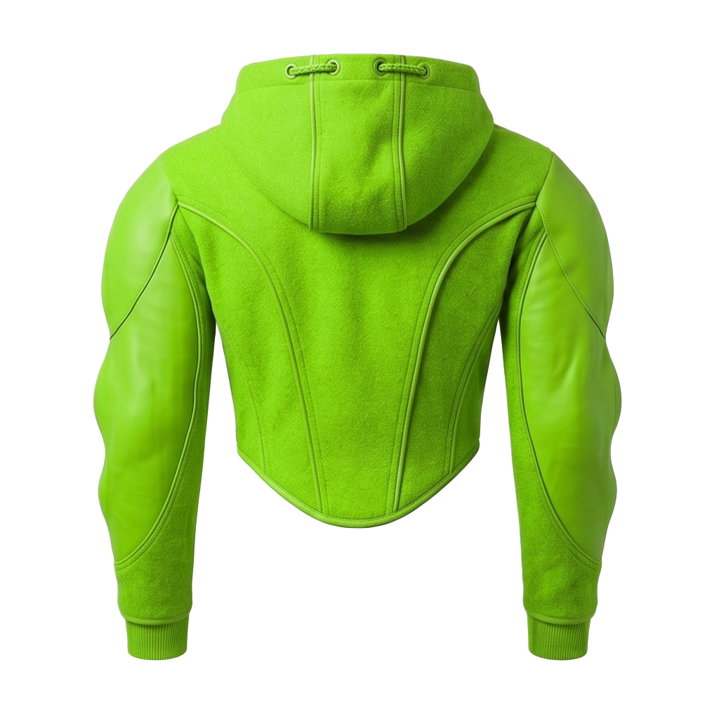 Neon armored hoodie with leather details and protective shell placement for visibility, comfort, and impact-aware wear.