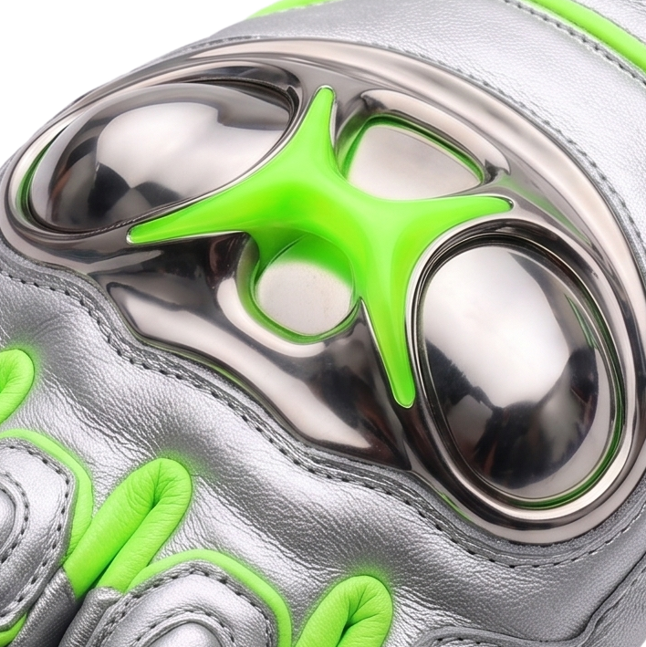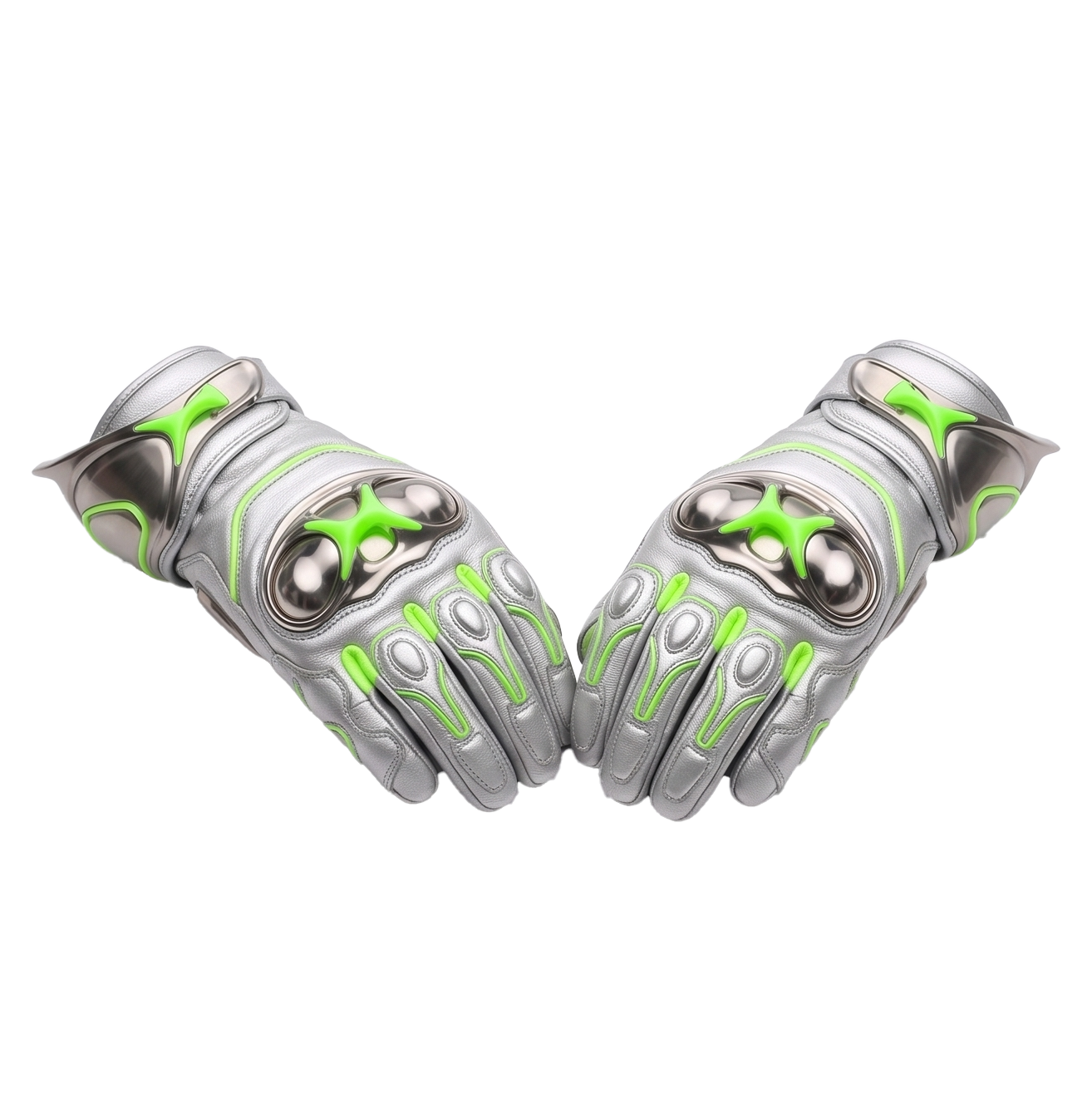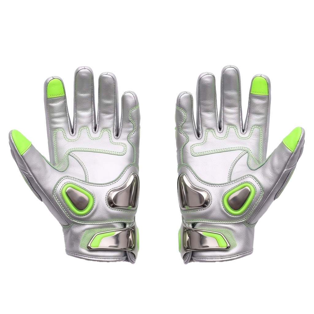 Highly protective technical gloves with reflective surfaces, reinforced grip zones, and sculptural metal armor details.