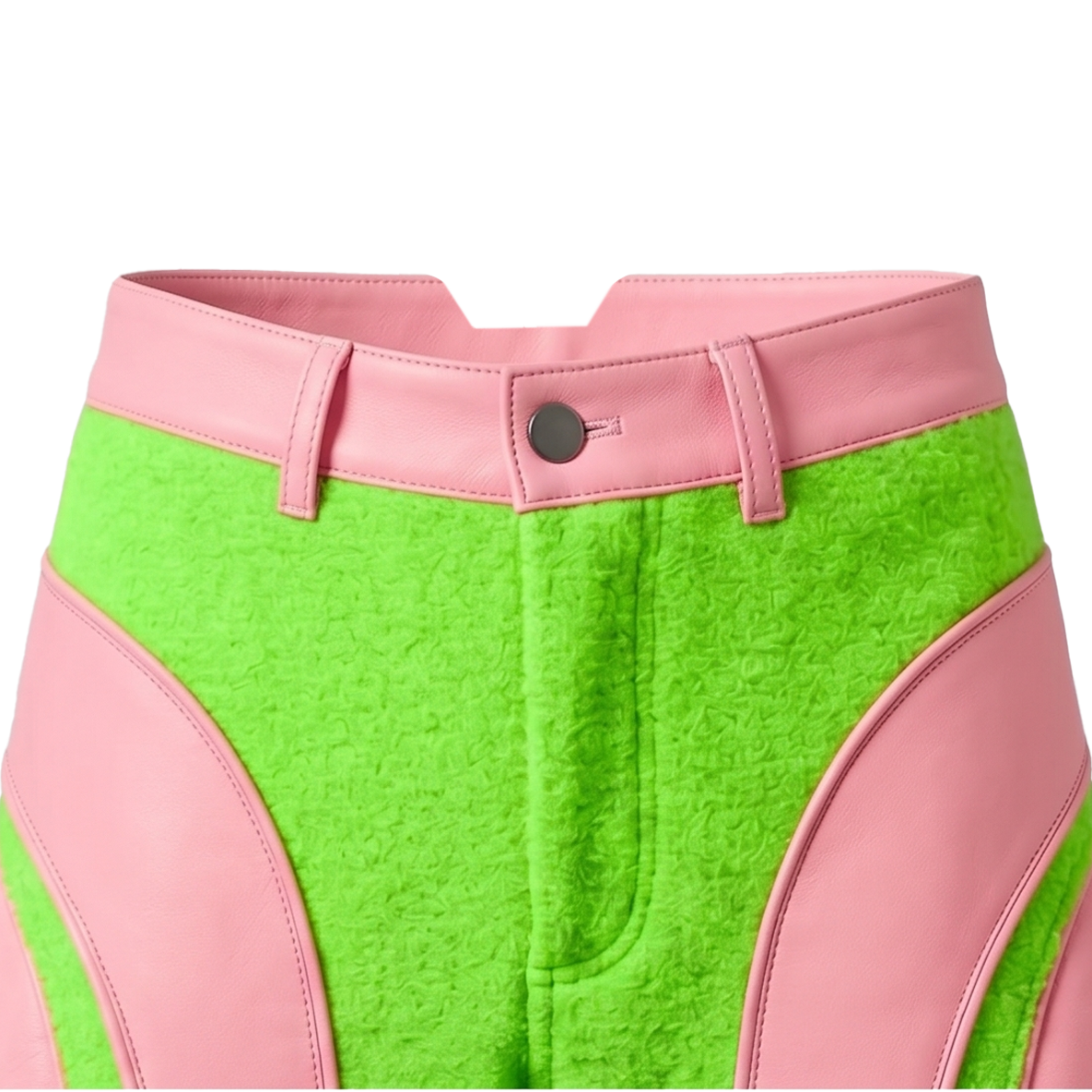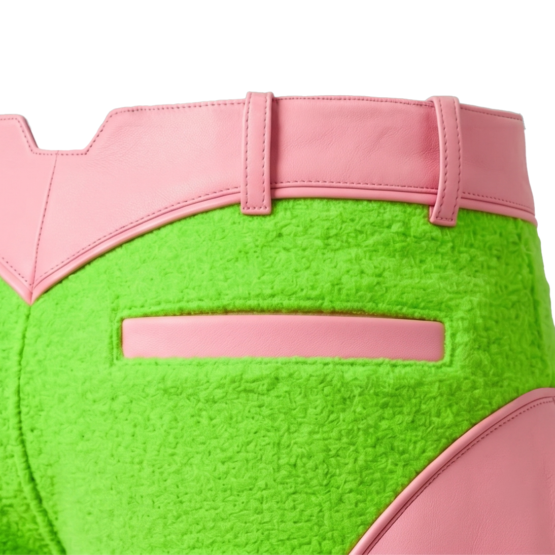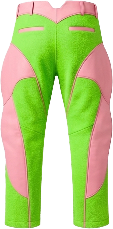 Protective technical pants with leather details, shaped shell panels, and high-visibility color blocking.